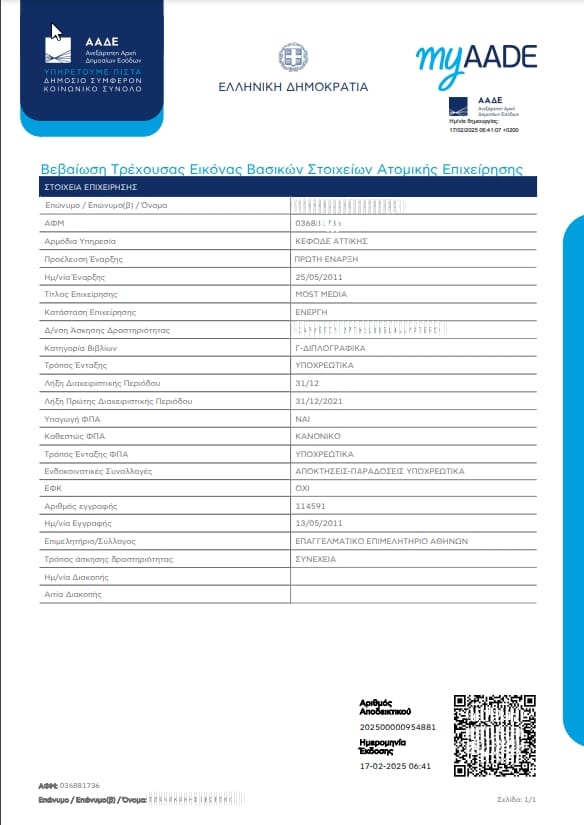 Βάσει του ανανεωμένου κώδικα ΦΠΑ (Άρθρο 39Α) οι επαγγελματίες που υπάγονται σε κανονικό καθεστώς ΦΠΑ, εκδίδεται τιμολόγιο χωρίς ΦΠΑ και είναι απαραίτητη η αποστολής εκτύπωσης σε pdf αρχείο (εκτύπωση με ημερομηνία ίδιας ή προηγούμενης ημέρας) των στοιχείων μητρώου της επιχείρησης όπως αυτά απεικονίζονται στο Taxis.
